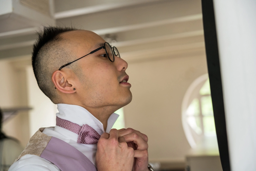 En tant que vidéaste mariage dans l’Eure en Normandie et dans les Yvelines, je capture aussi ces moments : ajustement de la veste, éclats de rire entre amis, regards complices avec le père ou les témoins.